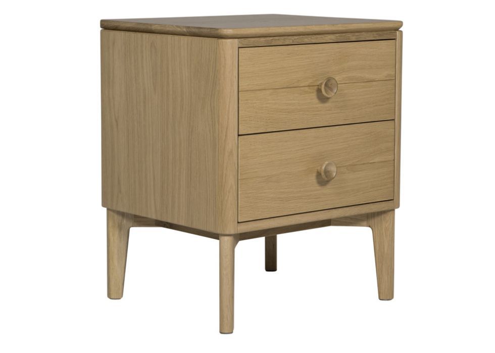 The Halden Bedside Table is crafted from a blend of solid oak and oak veneers, showcasing both strength and natural beauty. Its spacious tabletop provides ample room for a small lamp and alarm clock, while two drawers offer convenient storage for your bedside essentials.