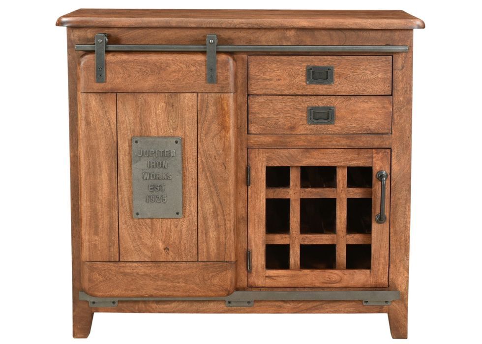 The Ironworks Dark Drinks Bar Cabinet adds a rustic charm to any entertaining space. It features a built-in wine rack that holds up to nine bottles, with two small drawers above for storing corkscrews, measuring tools, or other bar accessories. Behind the smooth-sliding door, a two-shelf cabinet provides ample space for glassware, a cocktail shaker, and other essentials.
