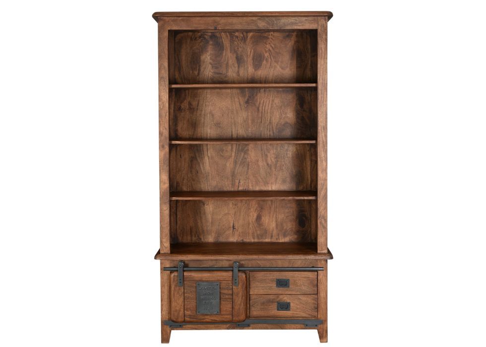 The Ironworks Dark rustic four-shelf bookcase is an ideal piece for showcasing your book collection. Its sturdy design features four spacious shelves for display, while the base includes a compact cabinet and two drawers that provide convenient extra storage.