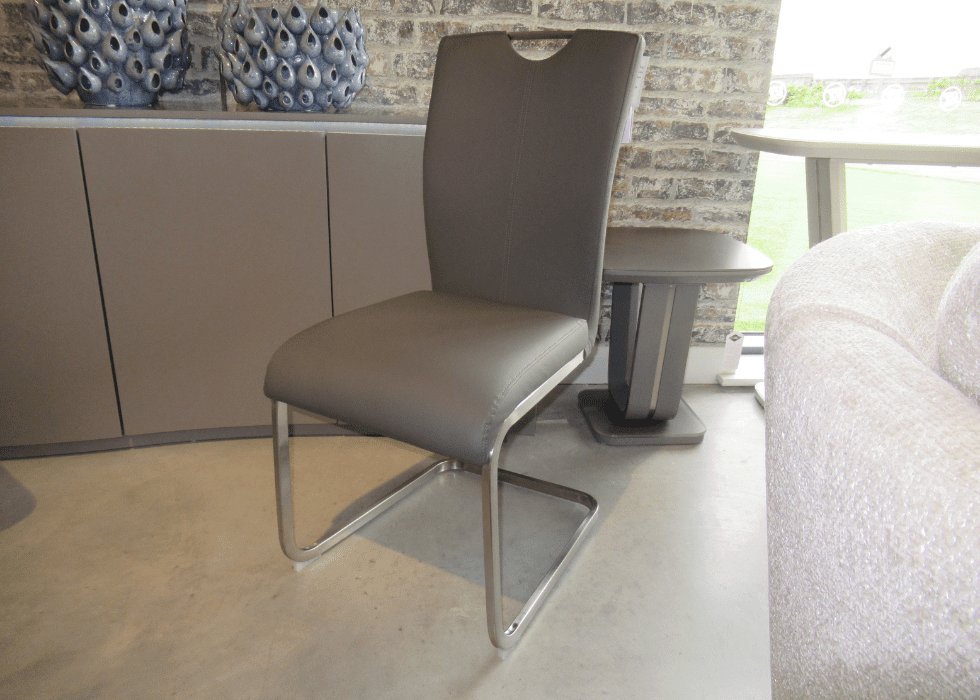 Make enquiry about this itemCantilever dining chair in grey P.U leather with chrome handle and legs.