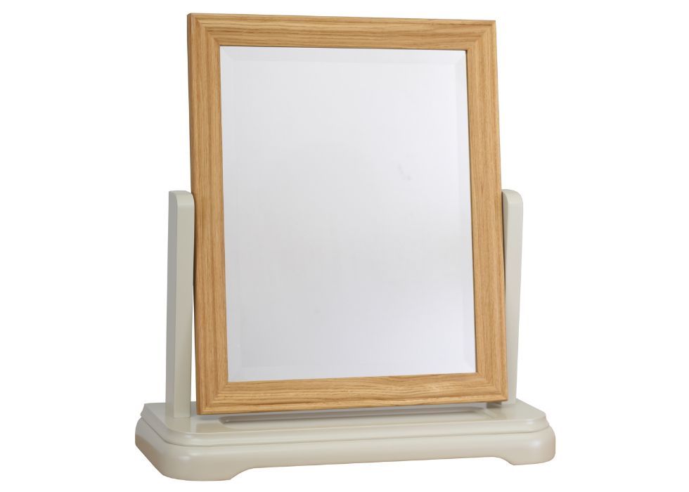 The Milburn Dressing Mirror features a beautiful combination of a natural wood frame and a painted stand, creating a stylish and timeless look.