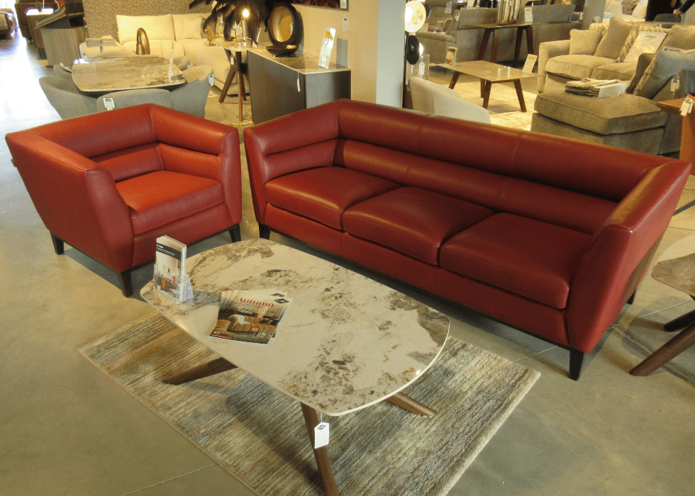 Make enquiry about this item3 seater and single chair in red leather with wooden feet.